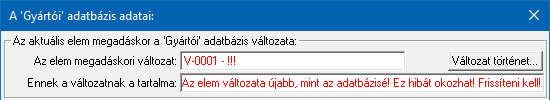 Amennyiben a tervbe beépített elem megadásakor az adatbázisnak újabb változata volt használatban, mint ami a lekérdezéskori időpontban telepítve van, akkor az adatbázis elem megadáskori változata piros színnel jelenik meg 'V-0001', és hasonlóan pirossal a 'Az elem változata újabb, mint az adatbázisé! Ez hibát okozhat! Frissíteni kell!' üzenet is. |