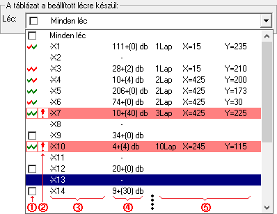 Az egyes oszlopok, mint a 'Léc' alfanumerikus azonosítója, a sorkapocs sorszám tartománya, valamint