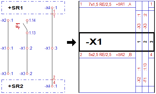 Az eredeti áramutas kapcsolási kép és az abból generált szerelésterv részlet. Ugyanis a rendszer sorkapocs elemzés során a bekötéseket a legoptimálisabban fogja elhelyezni a sorkapocs készülék vagy a kábelbekötés oldalán. Ha a sorkapocsba nem ugyanannyi bekötés érkezik, akkor a kiosztás más lehet mint egy korábbi állapotban volt.