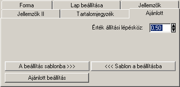 A beállítási panelen az anyaglista tervlapok generálására vonatkozó rendszer ajánlott beállítás állítható újra vissza. A panelen beállítható az érték állítási lépésköz, mellyel a beállítási panel további adatlapjain az értékek fel/le léptetése során a beállítandó érték növekszik, illetve csökken.
