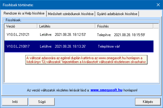 Az egyes verzió változások adatsora tartalmazza az adott verzió azonosítóját, ahol a pont utáni két számjegy a kiadás évszámának az utolsó számjegye, a következő a kiadás hónapja, majd a kiadás napja. A verziót egyértelműen ez azonosítja. A 'Letöltés' oszlopban a letöltés időpontja található, ha már letöltésre került. A 'Frisstés' oszlopban a frisítés időpontja található, ha már az adott verzió frissítésre, telepítésre került a a működő rendszerben Az egyes verzió változások adatsorra az egérrel duplán kattinta, még letöltés és telepítés esetén is információt kaphatunk a www.omegasoft.hu lapon. |