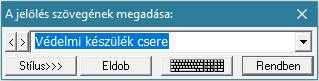 A 'Terv jelölés szövegesen' funkcióval egy egyedileg megadott szövegű terv jelölést helyezhetünk el a terven. A funkció csak akkor érvényes, ha a